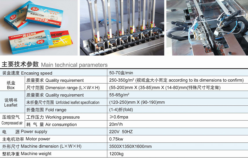 本產品是我公司結合國外裝盒機的先進技術及根據國內制藥行業的實際情況而研發的擁有新型、具有先進的多功能自動裝盒機,是機、電、氣,光一體化的高科技產品。本產品適用于各類顆粒袋包裝、粉袋包裝、刀片及類似物品一盒多袋、多片的裝盒包裝。該機還具有自動完成使用說明書的折疊、紙盒自動打開、物品裝盒、打印批號、封盒等功能。該機可以單獨使用亦可以與其他設備聯動使用,形成聯動生產線。